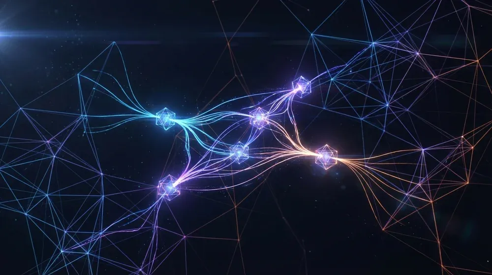 Autonóm adatfeldolgozó AI ügynökök hálózati vizualizációja egy komplex, intelligens rendszerben összekapcsolva.