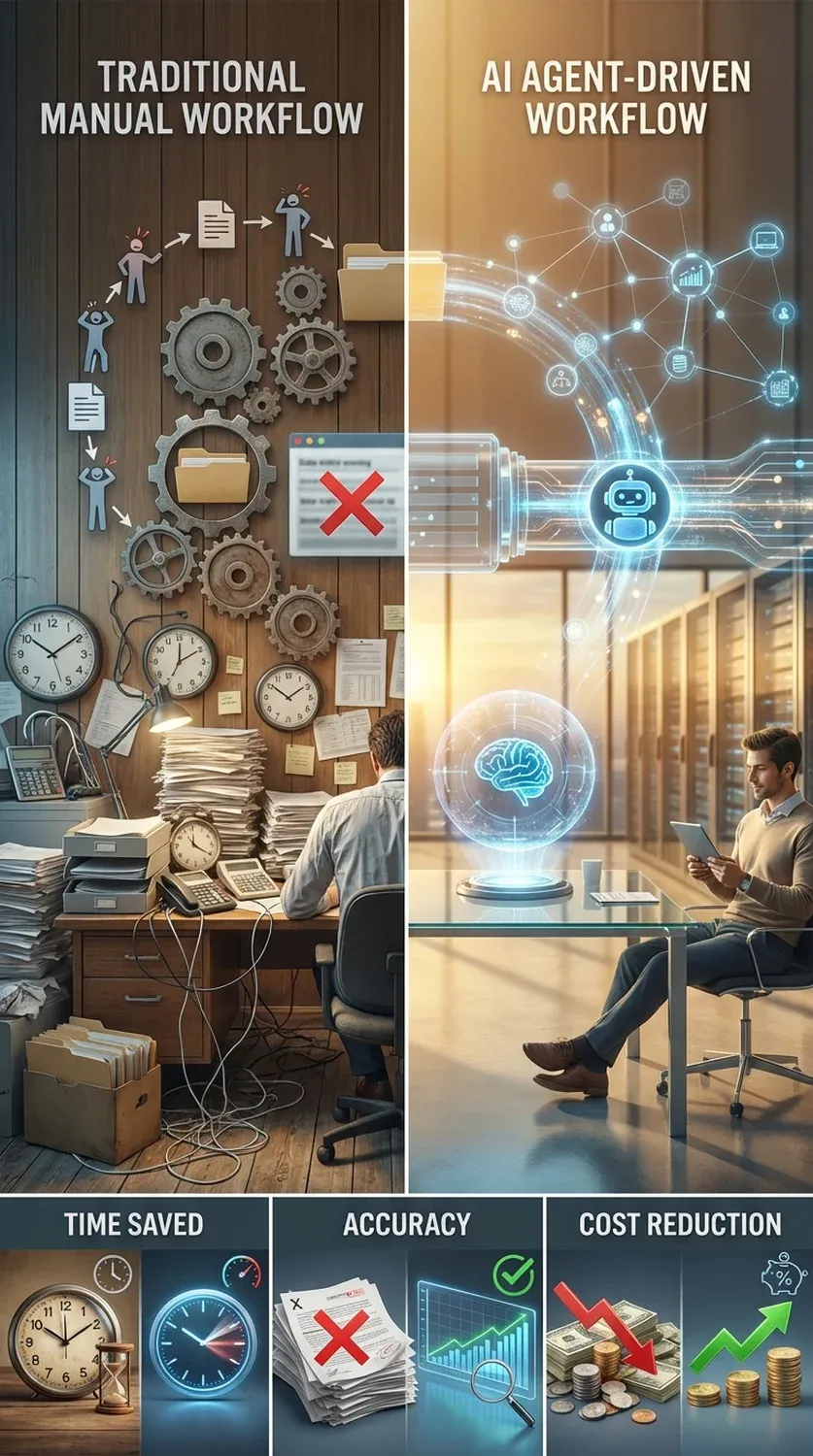 Infografika, amely a manuális és AI ügynök munkafolyamatokat hasonlítja össze, kiemelve az adatfeldolgozó AI ügynökök hatékonyságát.