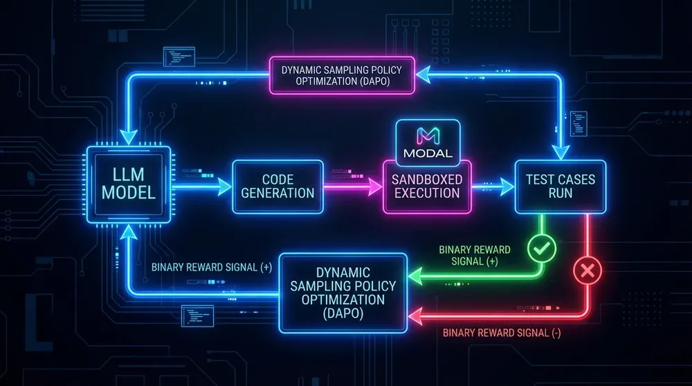 A magas teljesítmény elérése a versenyprogramozásban összetett gondolkodási kihívást jelent, amely erősen strukturált tréninget igényel. A NousCoder-14B a megerősítő tanulásra (RL) támaszkodik, amelyet a kutatók „verifikálható jutalmaknak” neveznek. Ebben a rendszerben a modell generál egy kódmegoldást, amelyet ezután több száz teszteset ellen futtatnak egy sandbox környezetben (például Modal platformok használatával). A modell egy egyszerű, egyértelmű bináris jelet kap: helyes vagy helytelen. Ez a mechanizmus biztosítja, hogy a visszajelzési hurok a végrehajtás integritásán alapuljon, ami sokkal szigorúbb követelmény, mint a természetes nyelvi feladatok esetében.