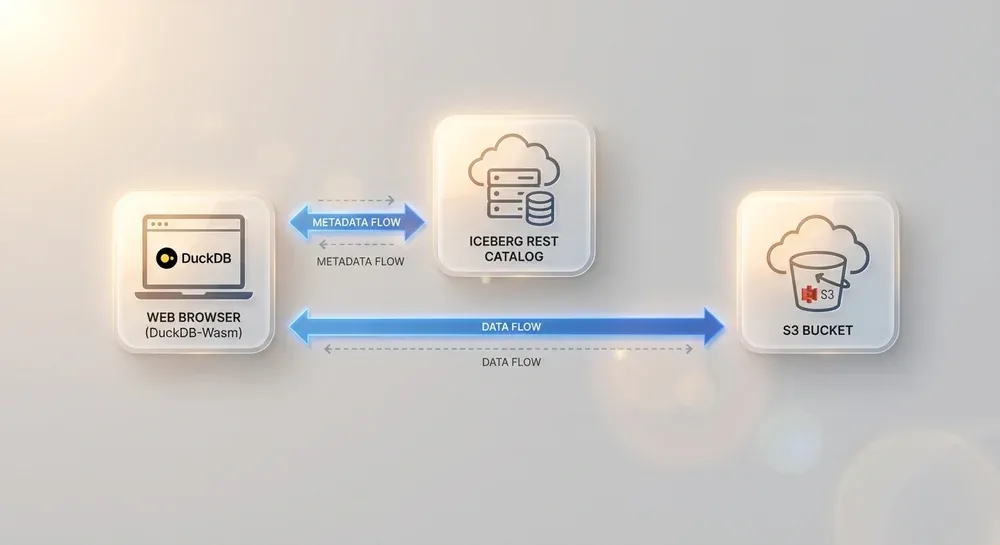Böngésző alapú big data analitika koncepció a DuckDB és Iceberg segítségével, szerver nélküli adatfolyamokat mutatva az adatfeldolgozó AI ügynökök számára.