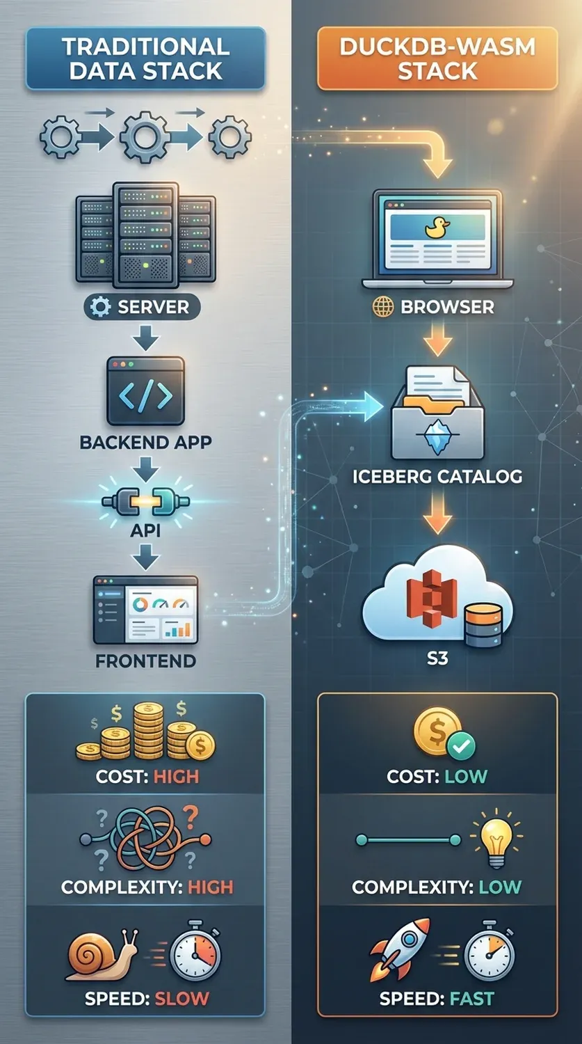 Infografika, amely a hagyományos adatvermeket hasonlítja össze a DuckDB-Wasm szerver nélküli modellel, bemutatva az adatfeldolgozás hatékonyságát.
