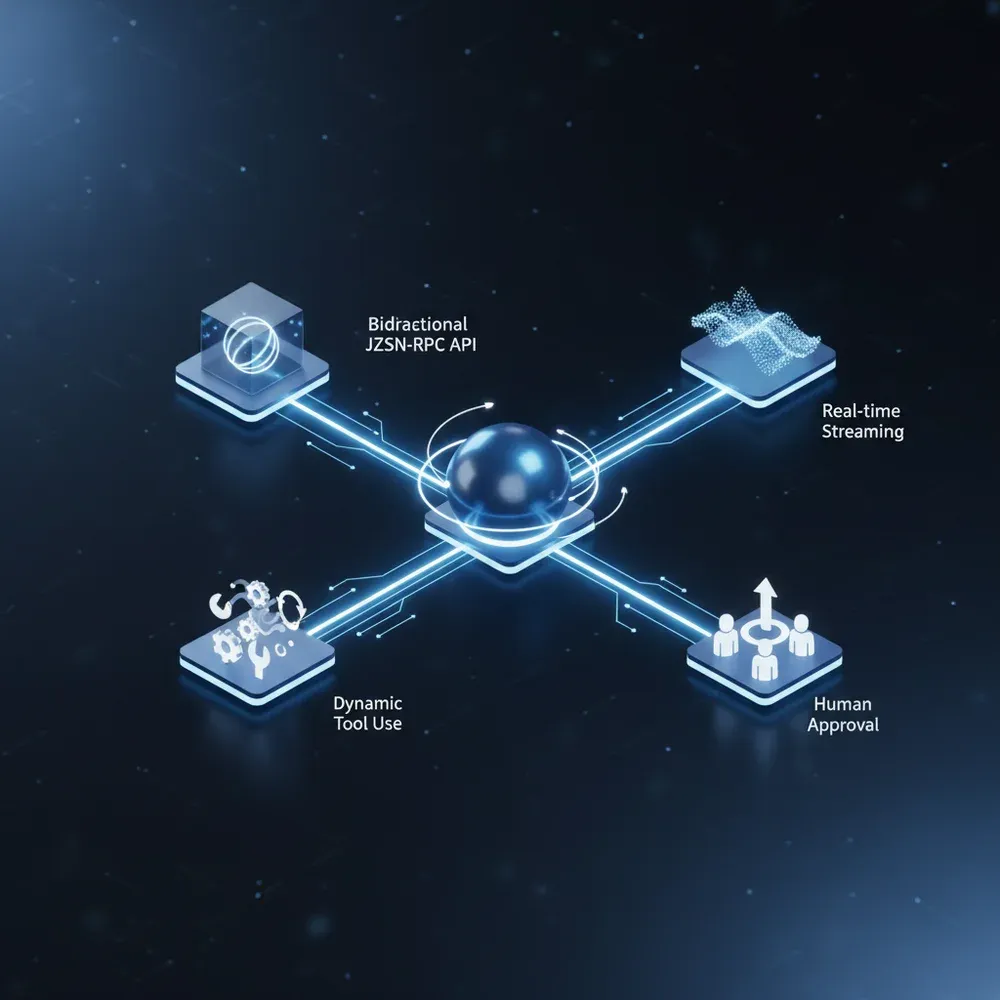 A szerver alapvető célja, hogy absztrahálja az ügynökök futtatásának infrastrukturális komplexitását. Lehetővé teszi az AI-mérnökök számára, hogy kizárólag az ügynök képességeire, döntési logikájára és az általa használt eszközökre (API-k, adatbázisok, belső rendszerek) összpontosítsanak. A szerver gondoskodik a többi kritikus funkcióról: az állapotkezelésről, a valós idejű kommunikációról, a változások követéséről és az emberi beavatkozási pontok kezeléséről.