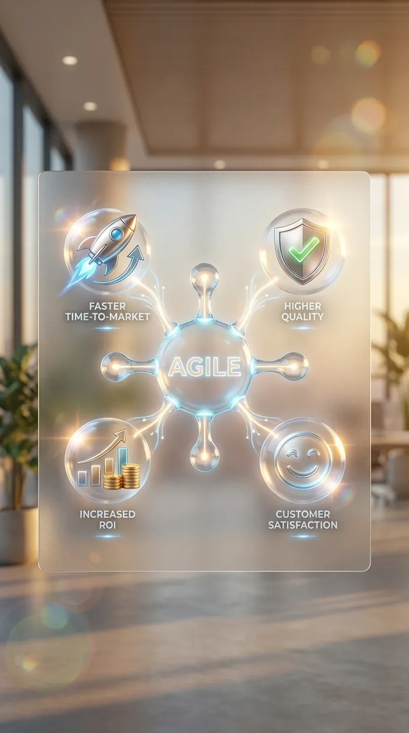 Infografika, amely az agilis fejlesztés alapvető üzleti előnyeit mutatja be, mint például a gyorsabb szállítás, a megnövekedett ROI és a jobb ügyfél-elégedettség.