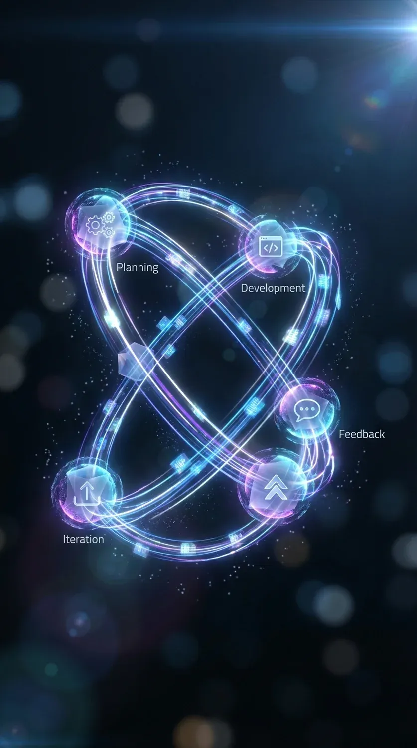 Az agilis fejlesztési módszertan illusztrációja, amely a tervezés, végrehajtás és visszajelzés iteratív ciklusát mutatja be professzionális weboldal készítési projektekben.
